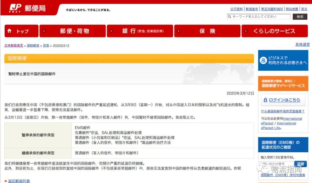 公告称,自3月9日以来,随着中国(内地)到日本的航班受到限制,运力进一步降低,邮件无法正常发送。因此,从13日起,除去部分普通邮件(包括普通航空信、明信片、盲人用邮件),日本邮政局将在一段时期内暂停揽收从日本寄到中国(内地)的国际邮件。