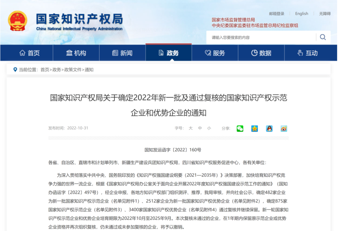 近日,国家知识产权局官网公布了《国家知识产权局关于确定2022年新一批及通过复核的国家知识产权示范企业和优势企业的通知》。公示名单显示,ky开元智能科技股份有限公司获评“2022年度国家知识产权优势企业”。